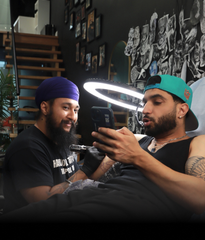 Harmeet Singh has collaborated with several Punjabi celebrities, including Sultaan, Rana Ranbir, Jazzy B, Genghis Khan, Teggi Pannu, Deep Jandu, and Karan Aujla. His work on these public figures has established him as a celebrity tattoo artist and a respected professional within the entertainment and art industries