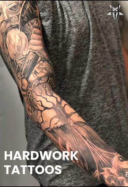 Full arm tattoos for men usually focus on bold themes like warriors, mythology, animals, geometry, and realism. Men choose full sleeves to express strength, purpose, and maturity. Our male clients prefer dark shading, deep contrasts, and large motifs that photograph well. Top requests at Hardwork Tattoos include the following.