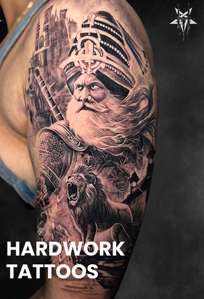 A Sikh warrior tattoo depicts the martial identity of the Khalsa through figures, symbols, and weapons. The design shows the wearer’s connection to bravery, faith, and Sikh history. A Sikh warrior tattoo uses visual elements like Khanda symbols, Shastar weapons like Kirpan and Chakram, and portraits of iconic warriors like Hari Singh Nalwa to express courage and devotion. The artwork often merges spirituality with strength to reflect the Saint Soldier identity of Sikhs.